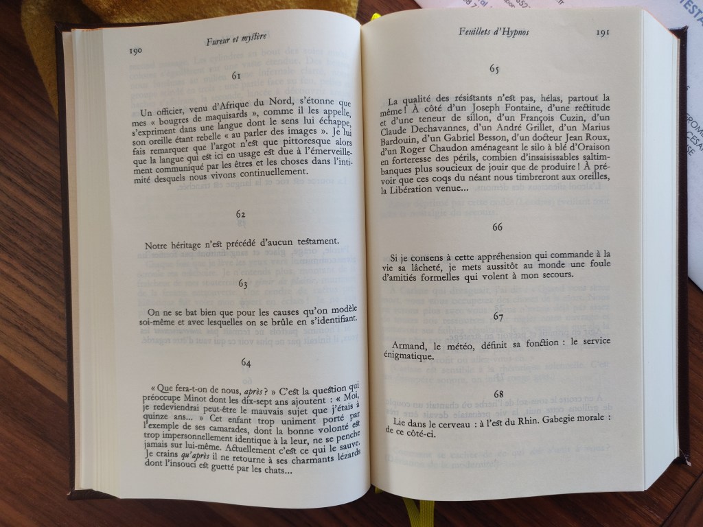 Sentiment étrange lorsqu’il y a deux jours j’ai lu cette phrase de René Char : « Notre héritage n’est précédé d’aucun testament », phrase qu’on m’avait refilée en classe préparatoire sans prendre la peine d’expliquer vraiment d’où elle venait, l’agrégé de philosophie méchu qui émargeait là se contentant de la précision laconique « Comme le dit René Char… », ce qui ne veut rien dire, mais enfin, la culture est ainsi, faite de trous mal bouchés avec le plâtre de la citation, si c’est René Char qui le dit, ou Heidegger, ou Hannah Arendt, obsessions des professeurs de philosophie pour classes préparatoires, c’est forcément vrai. Qui aurait l’outrecuidance d’en douter ? Sentiment étrange dis-je de découvrir cette phrase des années plus tard, sans la comprendre différemment, je crois, mais de tomber sur elle comme sur un objet trouvé dans son environnement textuel, de la lire réellement pour la première fois, là, dans les Feuillets d’Hypnos sous le numéro 62. Lisant ce texte, moi qui n’avais jamais rien pensé de René Char, est-ce que j’en ai soudain pensé quelque chose de précis ? Peut-être, — ce que je sais en tout cas, c’est que cette phrase dans le milieu littéraire qui est le sien avait un parfum différent, celui du sang, de la poudre, du maquis provençal, et non plus cette chose désincarnée et morne (morte) qu’on laisse tomber sur un ton sentencieux et qui, dès lors, est privée de toute vitalité, forme sclérosée et close sur elle-même, inaccessible — car qui pourrait bien vouloir y accéder ? La phrase est un organisme. Pas un lambeau de chair putride détaché du corps dont elle provient. La phrase est un univers. Pas un parpaing de béton dont on fait les murs à la va-vite. La phrase est un organisme, la phrase est un univers. La phrase est une vie.
