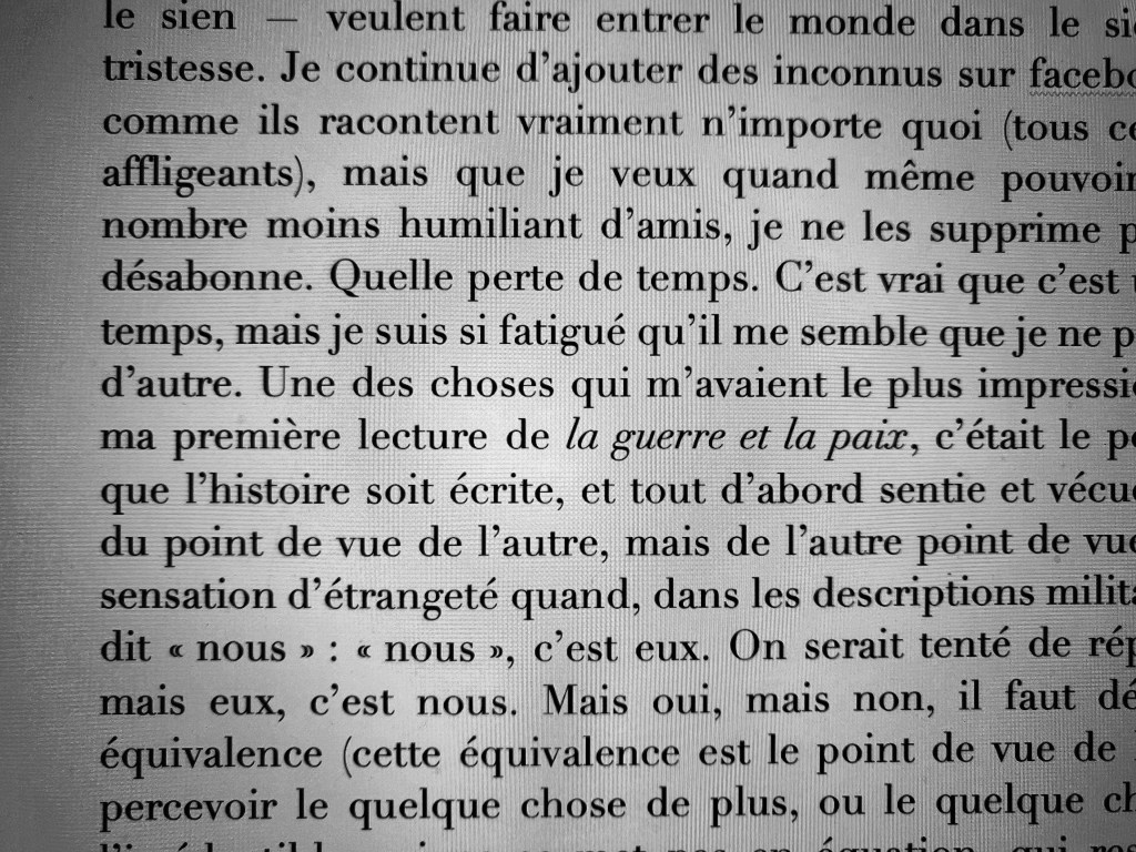 Je voudrais tant avoir quelque chose à dire mais je suis trop fatigué pour. Chercher ? Non : trouver. Je fais des phrases et des phrases et puis, m’apercevant que je fais des phrases qui veulent dire quelque chose, je me dis : « Comme c’est navrant de faire de telles phrases », et alors je les efface. Combien de milliers de signes effacées aujourd’hui ? Pas assez, pas assez. Trop de phrases comme tout le monde, des phrases comme les livres en sont remplis. La bienveillance, les bons sentiments de tous ces gens qui passent leur temps à « mettre des mots sur les maux ». Quelle misère. J’ouvre les yeux et la vision du monde est si prosaïque que je ne rêve que d’une chose : les refermer. Je fais rouler de vieilles vérités dans ma tête où une voix me chuchote sans faiblir : le moi est haïssable, Jérôme, le moi est haïssable. Tout autour de moi, les apôtres du bien — chacun le sien — veulent faire entrer le monde dans le siècle. Quelle tristesse. Je continue d’ajouter des inconnus sur facebook. Et puis, comme ils racontent vraiment n’importe quoi (tous ces gens sont affligeants), mais que je veux quand même pouvoir jouir d’un nombre moins humiliant d’amis, je ne les supprime pas, mais me désabonne. Quelle perte de temps. C’est vrai que c’est une perte de temps, mais je suis si fatigué qu’il me semble que je ne puis rien faire d’autre. Une des choses qui m’avaient le plus impressionné lors de ma première lecture de la guerre et la paix, c’était le point de vue : que l’histoire soit écrite, et tout d’abord sentie et vécue, écrite non du point de vue de l’autre, mais de l’autre point de vue. D’où cette sensation d’étrangeté quand, dans les descriptions militaires, Tolstoï dit « nous » : « nous », c’est eux. On serait tenté de répondre : oui, mais eux, c’est nous. Mais oui, mais non, il faut dépasser cette équivalence (cette équivalence est le point de vue de l’autre) pour percevoir le quelque chose de plus, ou le quelque chose d’autre, l’irréductible qui ne se met pas en équation, qui reste, subsiste, demeure toujours, pas le même du point de vue de l’autre : l’autre de l’autre point de vue.