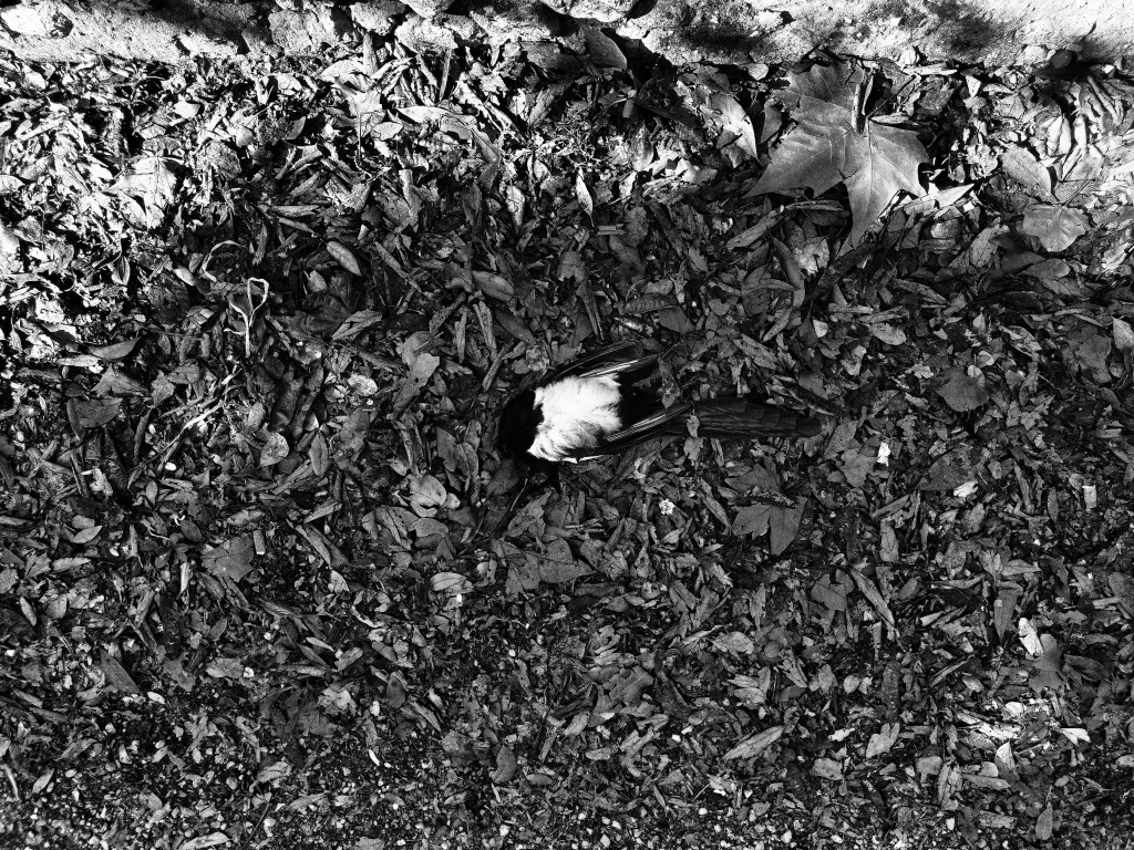 En pénétrant dans l’appartement, j’ai senti une présence menaçante. Maléfique, dirais-je, si, outre les États-Unis d’Amérique et quelques autres empiraillons théocratiques, ce mot n’était pas tombé en désuétude. Malfaisante présence, vaut-il sans doute mieux dire, que j’avais déjà perçue passant sous le balcon et levant la tête vers là-haut comme s’il y avait quelqu’un ou quelque chose qui rôdait. Mais qui peut bien rôder à midi sur le balcon d’un sixième étage d’une ville de province alors que l’appartement est censé être vide ? Tout le monde. Personne. Comment savoir ? J’ai chassé cette idée ridicule de mon esprit et j’ai continué mon chemin, tenant Daphné par la main, qui avait faim et mal aux pieds après son cours de danse. En pénétrant dans l’appartement, j’ai senti de façon plus aiguë cette présence menaçante, malfaisante, comme un mal absurde, mû par un désir aveugle, sans autre loi que la seule nécessité, le seul appétit, la seule faim. Voyant deux grandes ailes blanches prendre le large, j’ai compris qu’un oiseau de mer avait hanté ces lieux en mon absence, et j’ai pensé : Ah non, j’espère qu’un oiseau ne se pas encore perdu dans un coin d’où il faudra des heures pour le déloger, j’ai un déjeuner à préparer, moi, mais non, le mal n’était pas là. Le mal, ou plutôt les séquelles du mal, devrais-je dire, le mal était ailleurs : dans ce petit animal mort, ses entrailles vermillon à l’air libre, cet oiseau qui, ses plumes peuplant le balcon en attestaient sans aucun doute possible, avait dû souffrir avant de périr, d’autres traces sur les vitres encore moins ragoûtantes renforçaient la preuve, tenter de lutter en vain, massacré par plus fort que lui avant d’être mangé sans autre forme de procès. Un peu plus tôt, dans la matinée, je m’étais arrêté pour prendre en photographie un autre oiseau mort, sur le bas-côté du chemin, pas un pigeon, cette fois, une pie, je crois, et je n’imaginais pas que cette image vue et puis prise, je n’imaginais pas que cette image serait prémonitoire, qu’elle n’était pas à elle-même sa propre fin, une banale œuvre d’art, donc, mais le signe avant-coureur, la prémonition du carnage dégoûtant mais normal que j’allais découvrir un peu plus tard, une fois rentré chez moi tenant mon enfant par la main. Devant les entrailles béantes de la petite bête morte, je n’ai pas eu le courage de prendre mon appareil et la photographie, à la place, je me suis dit que j’allais vomir, mais en fait non, car j’ai un cerveau ancestral, j’ai un cerveau bien plus vieux que moi, à l’intérieur de ma boîte crânienne, un cerveau qui renferme des images que je n’ai jamais vues, contient des savoirs que je n’ai jamais connus, mais qui se ravivent, remontent à la surface, retrouvent toute leur vigueur à l’occasion d’une rencontre plus ou moins rassurante. Je n’ai pas vomi, non, mon moi plus vieux que moi m’en a empêché, je suis allé chercher un balai et un sac poubelle et, tâchant de garder mon sang-froid face à la mort imbécile qui maculait mon domicile, j’ai ramené en le faisant glisser le cadavre de la petite bête dans le sac plastique. Il était mou, mou et léger, très léger. C’était étonnant, je ne m’attendais pas à ce qu’il en soit ainsi, je m’imaginais quelque chose de plus compliqué, de plus lourd, de plus pesant, mais ce ne l’était pas, je m’imaginais qu’il était possible que la bête réagît, mais ce ne l’était pas, la mort est ainsi : molle, dérisoire, dépourvue de tout sens. Alors j’ai ramené en la faisant glisser cette bestiole qui ne pesait presque rien dans le sac poubelle et, faisant attention de ne rien toucher, je l’ai faite tomber au fond du sac par de petits mouvements secs et vifs du poignet, comme on ferait sauter des crêpes dans une poêle, mais à l’envers, quelle comparaison insolite, et j’ai refermé le sac de la façon la plus hermétique possible. Ensuite, j’ai dit à Daphné qui observait cette scène avec son pouce et son doudou, oui Daphné a encore son pouce et son doudou à la maison, mais sans paraître traumatisée le moins du monde, en tout cas, moins que moi, les enfants ont une vision du monde qui leur est propre, j’ai dit à Daphné que nous allions aller jeter le sac à la poubelle, et nous sommes descendus au sous-sol pour accomplir cette basse besogne. Dans l’ascenseur, pince-sans-rire, j’ai demandé à Daphné si elle voulait dire une petite prière pour le pigeon mort, mais elle m’a répondu que non en riant un peu. Je n’arrivais pas à me sentir proche de cette chose dans le sac et je n’y suis pas plus parvenu quand il a fallu poursuivre la besogne de plus en plus basse et nettoyer les traces de sang sur le sol. Je suis allé remplir une carafe d’eau avec de l’eau et une solution nettoyante bio à base de vinaigre, j’en ai versé sur le sol du balcon et, à l’aide du balai, j’ai frotté, m’étonnant que les taches partent si facilement. Est-ce que le souvenir part aussi rapidement ? Je ne me suis pas senti proche de cette chose sur le balcon puis dans le sac puis dans la poubelle non plus en frottant le balcon, malgré la doxa qui veut qu’il n’y ait pas de distinction entre les animaux et nous, je ne me suis pas senti semblable à ces animaux, je ne me suis pas vu moi, me jetant sur une bête ou une autre, qu’elle soit de mes semblables ou non, pour la manger toute crue parce que j’avais faim. Je ne me suis pas vu en train de le faire, tout comme je ne me suis pas vu en train d’enseigner à ma fille comment le faire, elle qui avait grand faim pourtant, comme elle le dit si bien, même si, dans mon cerveau, dans mon moi plus vieux que moi, il y avait des images d’hommes qui avant moi s’étaient jetés sur des bêtes, qu’elles soient de leurs semblables ou non, pour les manger toutes