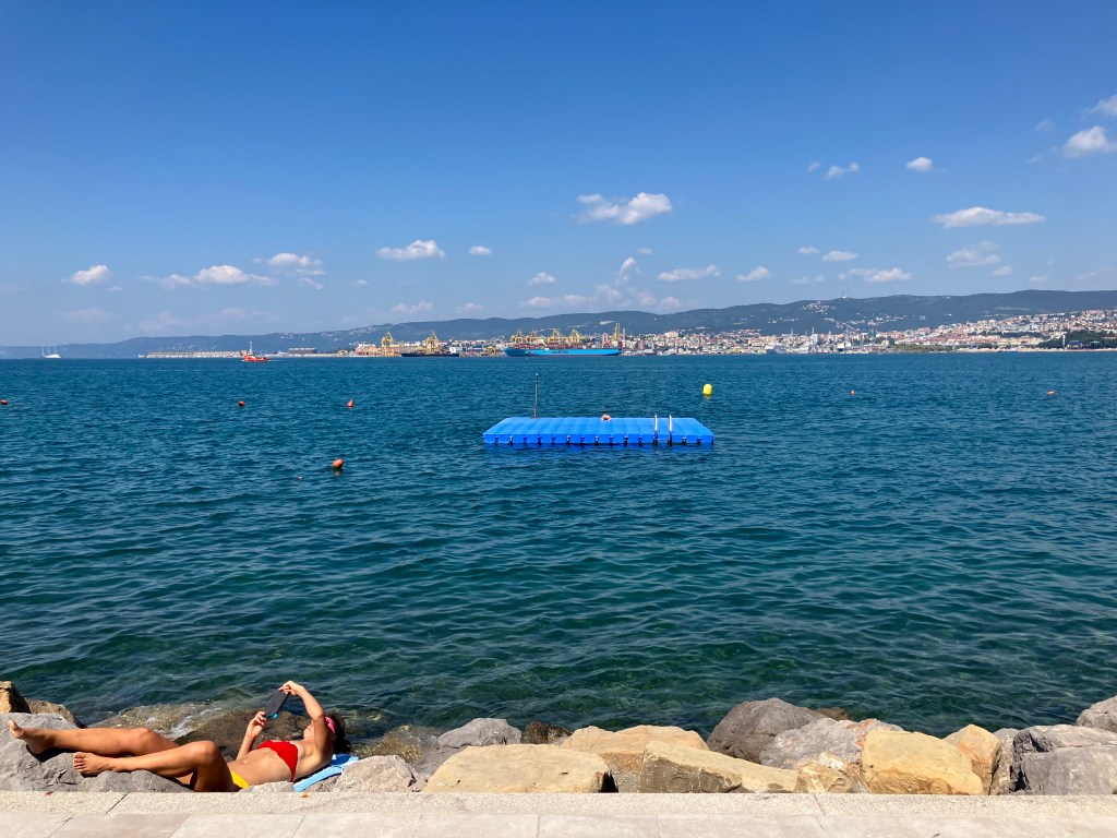 Au réveil, accablé par l’impression d’avoir été brûlé par la chaleur de la veille, j’ai écrit un poème de quelques lignes dans mon petit carnet noir. De nouveau écrivant, à présent, au début de la nuit, je n’ai pas envie de le lire, me suffisant de ce souvenir que j’en garde, un souvenir vague, épuisé, peut-être, comme je me suis senti ce matin, au réveil. Sur le bateau qui nous ramenait de Muggia où nous étions allés faire une brève excursion, « une petite croisière » comme je l’ai dit à Daphné qui m’interrogeait à ce sujet, je me suis senti assommé de chaleur, et je ne sais pas si c’était la sensation de mon corps même ou autre chose : une réaction à la vie, au monde et aux êtres qui le peuplent. Tout semble lointain, mais pas assez lointain, ai-je écrit il y a quelques jours, et ce n’est pas tout à fait ce que je pense à l’instant, ou alors en ce sens seulement que, cette étrangeté du monde, je la porte avec moi, qui m’accompagne partout où je vais. Accentuée par la chaleur, en ce début étouffant d’après-midi aux alentours de la Piazza Unità d’Italia, la répulsion que me causait la proximité d’être près de qui je n’avais pas envie d’être était si forte qu’à l’approche de ces corps autres qui sans cesse affluaient, je percevais que le mien était en train de se crisper toujours un peu plus. La promiscuité est le propre de l’animal ; n’est-il pas étonnant que nous la supportions encore, notre animalité ? Sur le Lungomare Venezia de Muggia, dernière ville avant la frontière slovène, les corps bronzent à même la pierre. De l’autre côté de la baie, les portes-conteneurs de la Maersk leur répondent dans une immobile chorégraphie. Au premier plan, la femme qui, dans son bikini à bas jaune et haut rouge, consulte son telefonino derrière ses lunettes roses, semble un ange maniériste tombé d’un ciel de plomb. Au second plan, sur une berge bleu plastique, un autre habitant de l’outremonde s’est échoué là où il demeure dans une stance perpétuelle. Des taches jaune orange ponctuent l’espace aquatique à peine qui, dans un dégradé chimique, conduit au navire du fond de la baie. Ainsi va l’été, l’Europe fatiguée. Comme le chat noir entre les jambes de ce Christ sponsorisé par le Rotary Club Trieste dans l’église Saint-Paul et Saint-Jean de Muggia, elle dort. Qui la voudrait tirer de sa léthargie, se heurterait à sa résistance somnambule : comme le veut l’idée reçue, il ne faut surtout par la réveiller.
