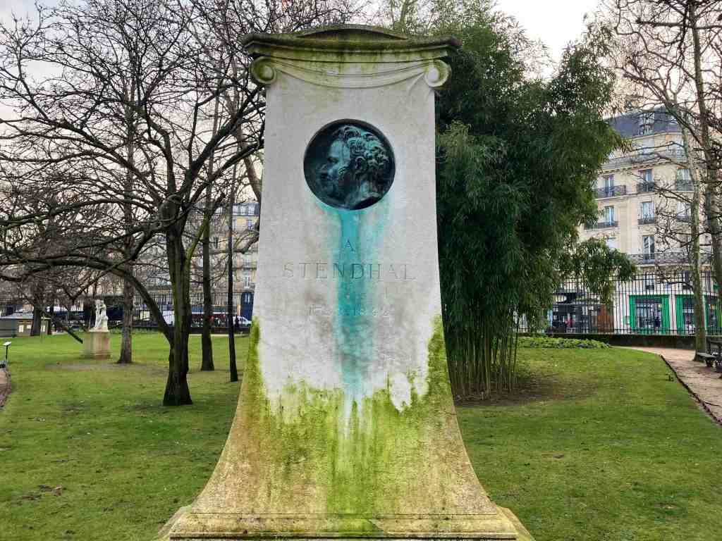 Ce matin, cependant que je courais en rond dans le jardin du Luxembourg, par cette froide matinée de janvier, je suis donc toujours vivant, pour qui cela intéresserait de le savoir, je me suis arrêté quelques instants devant le monument à la mémoire de Stendhal, et je l’ai pris en photographie, cela ne vaut peut-être pas grand-chose, mais c’était ma manière de prière à moi pour lui. Tant pis pour le chronomètre, ne me suis-je pas dit sur le moment, c’est en écrivant que je me dis que je pourrais intégrer cette remarque, fictive donc, en passant, pour faire un trait d’humour, ou quelque pirouette ironique, et je me voyais déjà en train d’ajouter que Stendhal nous aurait trouvés bien ridicules, nous autres, qui tournons en rond dans le jardin, pour perdre du poids, garder la ligne ou la santé, sculpter notre corps que rien d’extérieur à lui-même ne vient plus guère inquiéter, quand lui, malgré son physique de jeune fille de quatorze ans, marcha dans l’armée de Napoléon — ainsi passe la gloire des peuples —, mais je ne le ferai pas. Je me contenterai de raconter comment je me suis arrêté devant ce petit monument discret, comment je l’ai pris en photographie, et comment ce fut pour moi, aujourd’hui, date de l’anniversaire d’Henri Beyle, ma manière de penser à lui. Il a quelque chose d’étrange, ce petit monument, tout couvert de mousse, qui descend au marron, et qui tient sans doute à cette coulée vert de bronze qui tire sur la turquoise et dégouline le long des joues d’Arrigo pour imbiber la pierre. On peut avoir l’impression qu’il pleure, mais il faut avoir de l’imagination. Et on n’en a plus beaucoup, c’est à craindre, de l’imagination. N’importe. Quand je me suis arrêté devant le médaillon pour le prendre en photographie, j’ai été un peu déçu que personne n’ait eu l’idée de déposer quelques fleurs à son pied. J’eusse bien aimé le faire, mais quelles étaient ses préférées ? Je n’en ai aucune idée. Tout ce que je sais, c’est que les fleuristes parisiens vendent du mimosa fané au prix de l’or dont il n’aura jamais la couleur. Au dos du monument, là où se trouve la liste des œuvres considérées comme les plus célèbres à l’époque de son édification (1920) — De l’amour, Vie de Rossini, Promenades dans Rome, Le rouge et le noir, Mémoires d’un touriste, La chartreuse de Parme —, la pierre est criblée d’impacts de balle, traces des combats pour la libération de Paris, en 1944, que le temps ni l’oubli n’ont encore effacées. Je reprends ma route. Tout cela, je le dirai plus tard. En attendant, dix kilomètres m’attendent et une heure et quelque d’exercice. En avant.