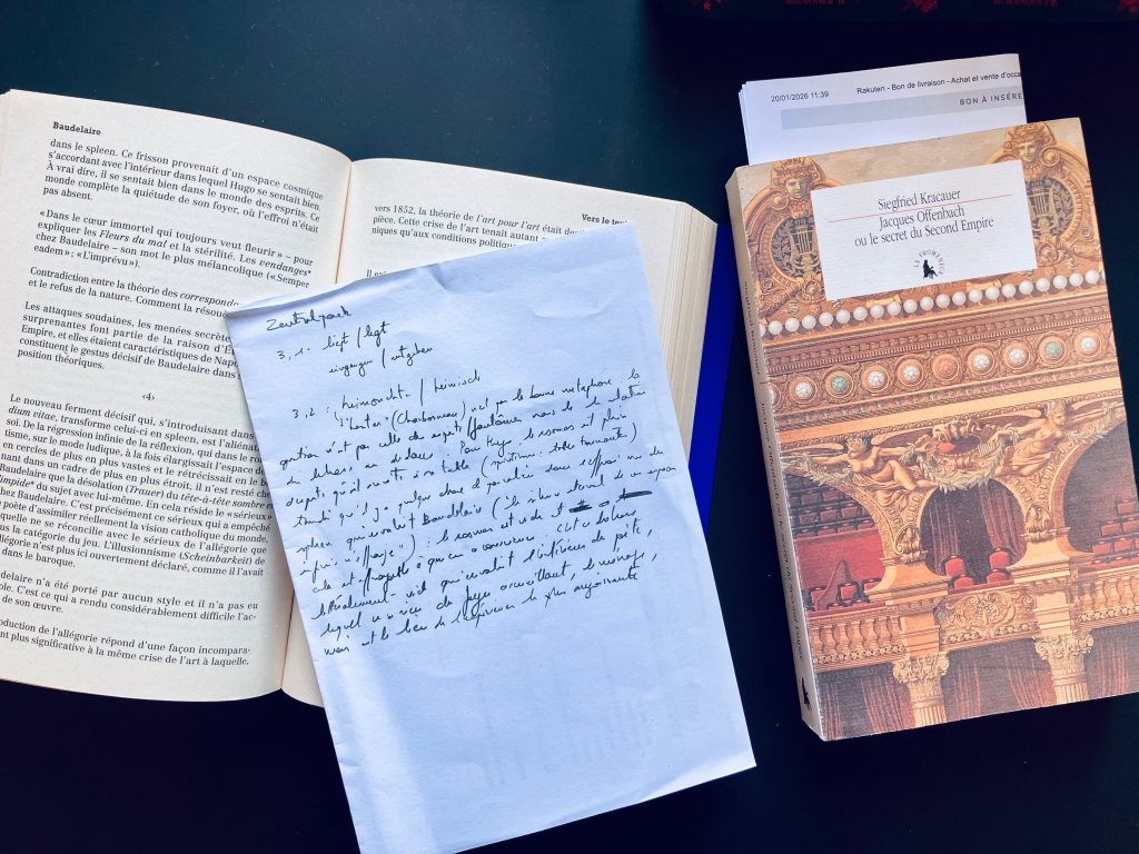 Offre de rachat. — Cette semaine, outre les produits de première nécessité, dont des oranges sanguines, de succulentes tarocco, notamment, qui me viennent d’Italie en attendant que j’aille à elles, le mois prochain, à Rome, je n’ai dépensé pour moi-même que 6,25 euros, à savoir 3,25 euros pour un exemplaire d’occasion de l’ouvrage de Siegfried Kracauer, Jacques Offenbach ou le secret du Second Empire, auxquels s’ajoutent 3 euros de transport via Mondial Relay. Je ne crois pas que ce soit suffisant pour vivre, dans l’absolu, mais, comme je ne vis pas dans l’absolu, cette semaine, cela m’aura largement suffi. Hier au soir, j’ai lu avec un rare enthousiasme les cinquante premières pages du livre de Kracauer, à la fois denses, vives, intelligentes et passionnantes. On peut évidemment faire des rapprochements entre Kracauer et Benjamin, dans la mesure où leurs projets portent sur la même ville, la même période, avec une intention semblable, et que Kracauer emploie comme Benjamin le concept de « fantasmagorie », notamment, mais un coup d’œil, même rapide, fait voir toute l’étendue de ce qui les sépare. Kracauer avance, et le rythme de sa prose semble se régler sur le rythme du cancan de cette époque qu’il décrit avec verve (« Ce Musard infernal, / C’est Satan qui conduit le bal »), tandis que Benjamin semble toujours en train de ralentir, toujours sur le point de s’arrêter. Hier, j’ai passé la matinée à traduire les premières pages de Zentralpark (§§ 1 à 3) et ce qui m’a frappé, au cours de cet exercice, c’est le travail infime sur la langue qui est à l’œuvre chez Benjamin, les traits fins des détails qui cherchent à décrire avec la plus grande précision une physionomie. Les métaphores sont infiniment précises, et il faut leur accorder une attention tout aussi minutieuse pour pénétrer dans le labyrinthe du texte. Contrairement à celle de Kracauer, chez qui on sent le métier de journaliste, qui sait parler à son lecteur, l’écriture n’est pas élégante, elle est pleine de répétitions, elle n’est pas fluide, elle ne coule pas, semble venir buter sur chacun des mots qu’elle croise, non parce qu’elle ne sait pas quoi dire, hésite, mais parce qu’elle cherche l’expression la plus juste, la plus précise, creuse des galeries dans le langage pour se frayer son chemin. Dans le § 3, 2, où Benjamin oppose Baudelaire et Hugo, il emploie deux expressions formées sur la même racine (heim), une pour chacun des protagonistes : heimsuchen pour Baudelaire et sich heimisch fühlen pour Hugo, expressions qui décrivent deux relations contraires au dehors, deux rapports incompatibles entre l’intérieur et l’extérieur. Charbonneau traduit heimsuchen par « hanter », mais ce n’est pas la bonne métaphore. Le paragraphe ne porte pas tant sur les esprits, les fantômes que sur la relation du dedans au dehors. Pour Hugo, dit Benjamin, le cosmos est plein d’esprits qu’il invite à sa table (spiritisme : tables tournantes) tandis qu’il y a quelque chose de pascalien dans l’effroi nu du spleen qui envahit Baudelaire (« le silence eternel de ces espaces infinis m’effraye ») : le cosmos est vide et cela est effroyable à qui est saisi par cette conscience. C’est le dehors littéralement vide qui envahit l’intérieur du poète, lequel n’a rien du foyer accueillant (le ménage), mais est le lieu de l’expérience la plus angoissante. L’intérieur de Baudelaire est envahi (heimsuchen) par le vide cosmique tandis que Hugo invite les esprits à sa table, se sent chez lui (sich heimich fühlte) dans un cosmos surpeuplé. À une telle allure, par conséquent, a-t-on envie de dire, l’écriture ne peut pas avancer, ou alors le plus lentement du monde. Ainsi, alors qu’Offenbach, en tant que figure de la fête, est vitesse, Baudelaire et les passages, spleen et architecture détruite, figures de la tristesse, sont lenteur. En consultant les nouvelles du monde, ce matin, j’apprends qu’une série télévisée dont le personnage principal s’appelle Laura Stern (c’est d’ailleurs le titre de la série, « L’affaire Laura Stern ») sera prochainement diffusée : Laura Stern, comme mon personnage s’appelle dans la Vie sociale. J’essaie de me persuader que cela n’a rien à voir, et puis que c’est indifférent, mais je n’y parviens pas : j’éprouve de la répugnance, comme si l’on m’avait volé quelque chose pour en faire un sous-produit de mauvais goût. Mais pourquoi est-ce que je consulte les nouvelles du monde ? Tout est sale, sali, salissant. Daphné, qui a vu le livre de Kracauer sur mon bureau, et qui nourrit une vive passion pour Offenbach, d’une petite voix polie, me demande si, quand je l’aurai fini, elle pourra le lire, elle aussi. Je lui dit que oui, mais ne lui pas que c’est pour cela, en vérité, que j’en ai fait l’acquisition. On croit que tout est sale, sali, salissant, mais ce n’est pas vrai : il y a toujours un instant, un être qui rachète.