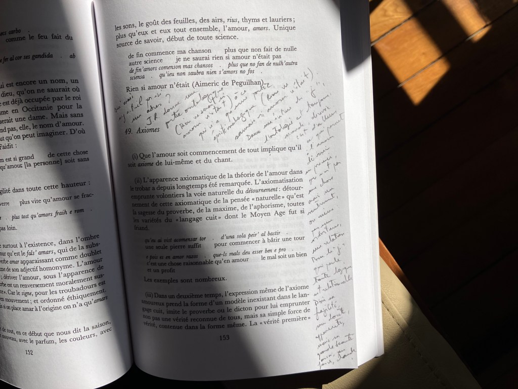 Devant le portail de l’école, en attendant les enfants qui tardent toujours un peu à sortir, on s’entretient de la charge mentale des vacances au ski. Sur le moment, je comprends : « de l’agence Husky », et me dis : « Drôle de nom pour un agence de com’, quand même, non ? un nom de chien », associant dans cette élocution mal comprise l’agence de mon imagination avec celle où Nelly a travaillé, une semaine durant en arrivant à Marseille, il y a quelques années de cela, MCM PR, à Malmousque, devant laquelle je suis passé à plusieurs reprises la semaine dernière, et qui semblait toujours fermée, définitivement, peut-être, ai-je pensé et dit à Nelly, qui avait le même sentiment que moi, oui. Mais non, pour la petite-bourgeoisie, ce n’est pas le travail qui est pénible, ce sont les vacances. Entendre cette conversation me cause une sensation désagréable (devant le portail de l’école, je tâche de ne parler à personne, de peur d’avoir à participer à quelque chose de ce genre, mais comment se cacher quand il n’y a pas de cachette ?), et j’ai envie de partir le plus loin possible d’ici, mais je ne parviens pas à y échapper, j’ai beau reculer de quelques pas (toute la distance que je puis parcourir sur ce petit bout de trottoir), les phrases ineptes continuent de faire siffler mes oreilles. Où se cacher quand il n’y a pas de cachette ? Même si je ne me vois pas, je sens de l’intérieur que je grimace derrière mes lunettes de soleil. Jusqu’à ce que, enfin, Daphné apparaisse. Et alors, sans avoir besoin de me voir, ni du dedans ni du dehors, je sais qu’un sourire illumine mon visage. Rayonne comme le soleil dans le ciel de la fin de l’hiver. Ce matin, quand je suis allé courir par ce temps en avance sur le printemps, thème décisif chez les poètes qui me préoccupent, le printemps, souligne Jacques Roubaud dans l’essai qu’il leur a consacré, la Fleur inverse, je me suis fait à moi-même un certain nombre de remarques concernant les troubadours. Et puis, j’ai noté une phrase que j’ai assortie d’un point d’interrogation entre parenthèses « (?) » parce que, en sachant si peu à leur sujet, je ne sais si je puis me permettre d’avoir des idées les concernant. Mais enfin, je ne les contrôle pas, mes pensées, et ne pas les consigner, au cas où elles ne seraient pas fausses, ne m’avancerait guère. Hier au soir, en écho, et en contrepoint aussi à la rigueur axiomatique avec laquelle Roubaud aborde son sujet, j’ai écouté deux versions de « Lanquan li jorn son lonc en may », de Jaufre Rudel, la canso de l’amour de loin, et me suis émerveillé des variations (occitanes, arabisantes) auxquelles peut donner lieu une chanson si ancienne (Jaufre a vécu au cours de la première moitié du XIIe siècle). Et ce n’est pas la modernité de la chanson qui me fascine — moderne, elle ne l’est pas, elle est chant d’avant la modernité — comme il me semble que toujours on cherche dans les œuvres du passé matière à nous conforter, nous réconforter, alors que nous devrions plutôt être inquiets —, mais son ancienneté, sa beauté étrange, et la langueur qui m’envahit à son écoute, douce et enchanteresse. La vida (l’histoire, souvent légendaire, qu’on raconte à propos des poètes provençaux de la fin du XIIe et du début du XIIIe siècle) veut que Jaufre, qui est de Blaye, tombe amoureux d’une comtesse de Tripoli qu’il n’a jamais vue mais dont il a seulement entendu vanter les mérites. Il écrit des chansons pour dire l’amour qu’il a pour elle avant de se décider à partir en croisade pour la rencontrer enfin. En chemin, ou en bateau, plutôt, il tombe malade et, à son arrivée à Tripoli, est hospitalisé. La belle, apprenant la nouvelle, vient le voir. Alors, sous son charme, il recouvre vue et ouïe et meurt exaucé dans ses bras. La fameuse comtesse, quant à elle, accablée par la douleur que lui cause cette perte, après l’avoir fait enterré avec les honneurs qu’elle lui doit, entre dans les ordres. Et — ceci n’est pas sans rapport avec la phrase que j’ai notée ce matin après être allé courir —, n’est-elle pas merveilleuse, cette façon de tout asservir à l’amour : ce n’est pas le fanatisme religieux ou politique qui pousse Jaufre à partir en croisade, mais son amour, qu’il veut vivre, à tout prix, au péril de sa vie, même ? Tu me diras, c’est ça ou les vacances au ski.